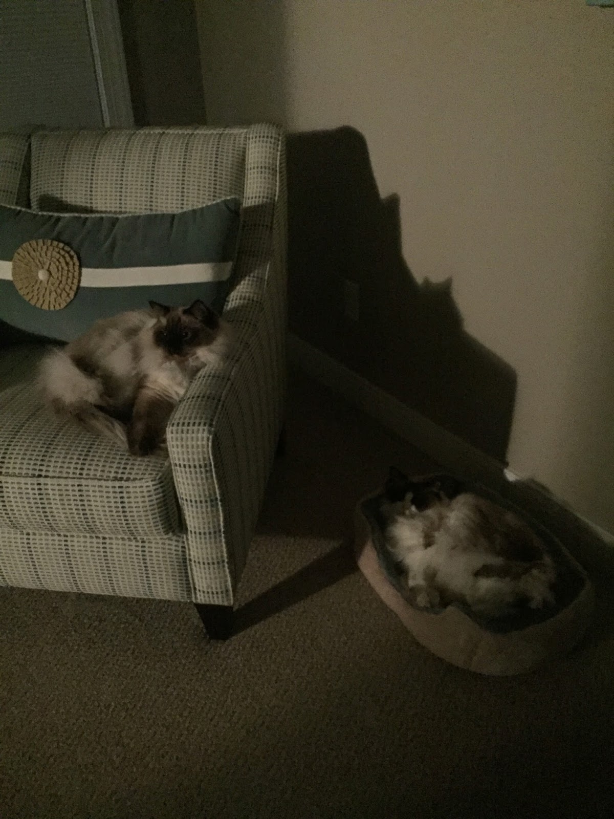 At some point most nights, both cats end up in our room in their spots. Jovie adopted her new bed. Her new thing is dragging it around the bedroom. I am not sure where she wants it.